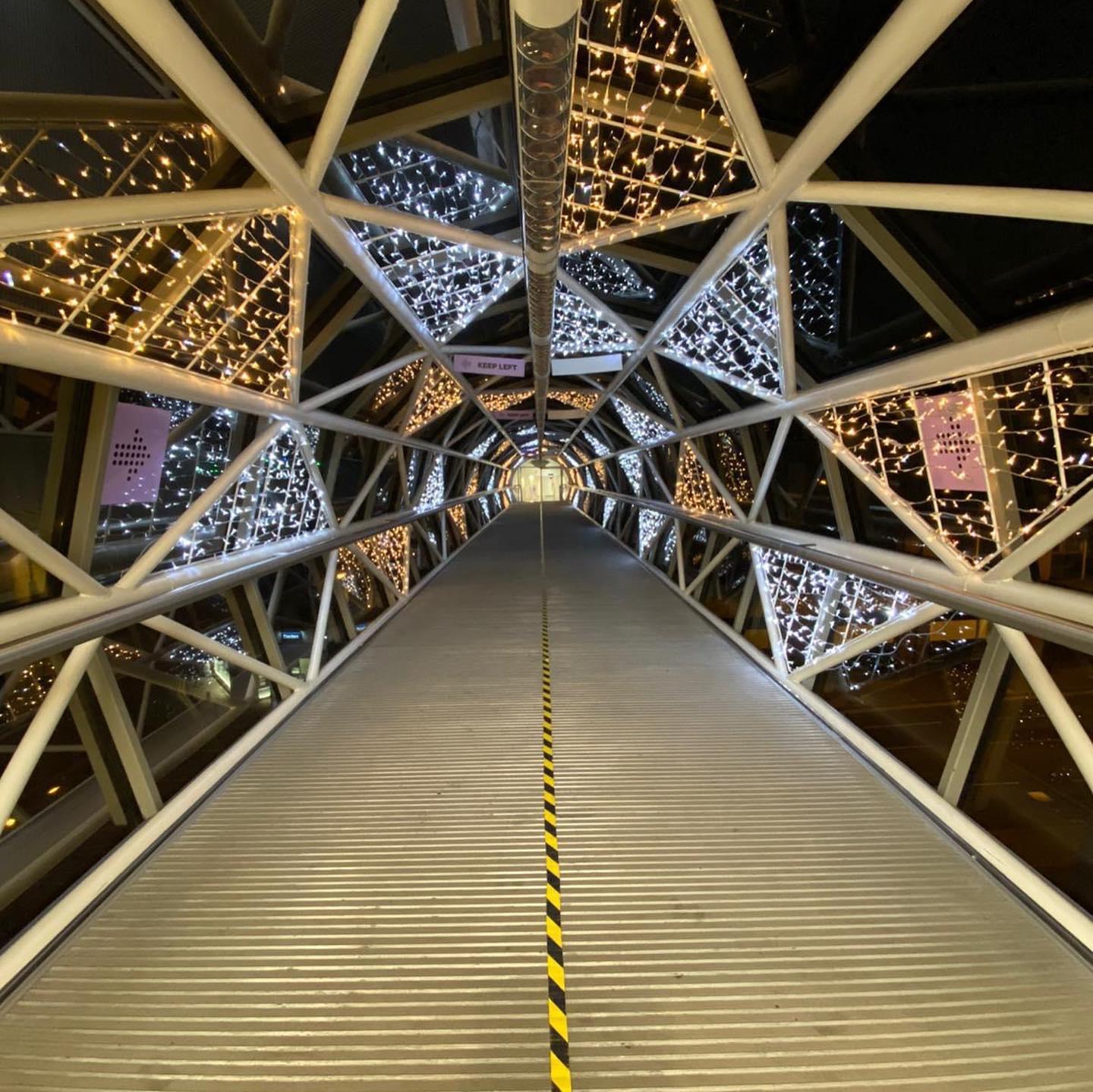 We stepped away from the traditional Christmas theme to create a scheme full of warm white and pure white lights, using natural forms to create daffodil-head inspired starbursts and huge golden mirrored chandeliers, dripping with lights and crystals, staggered throughout the huge open spaces to give a sense of depth and height.