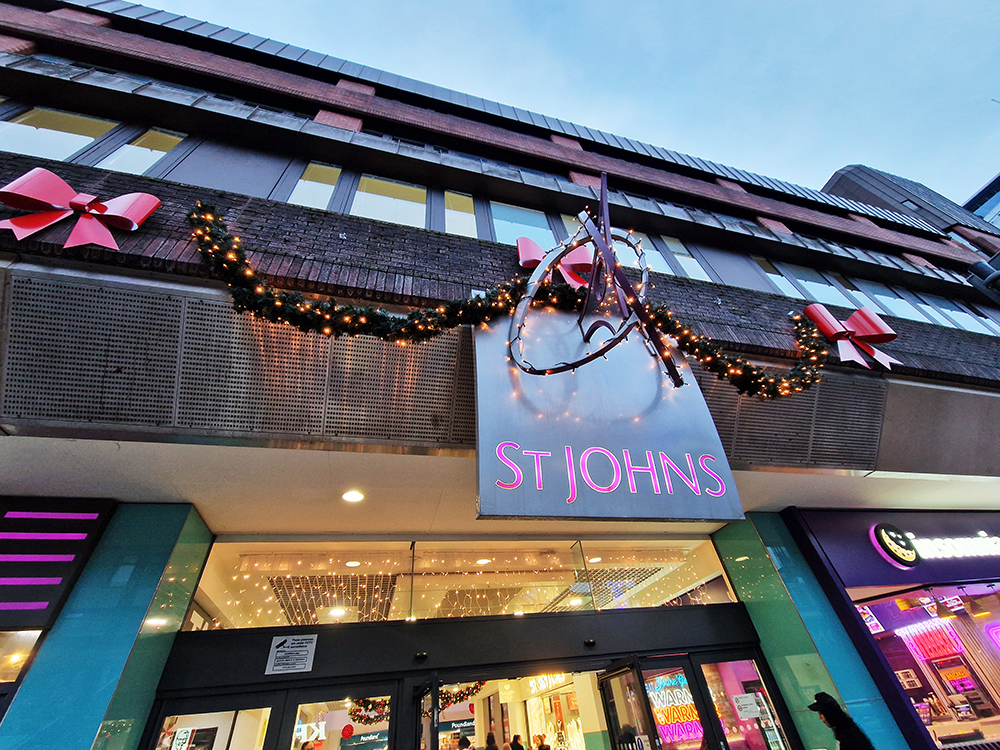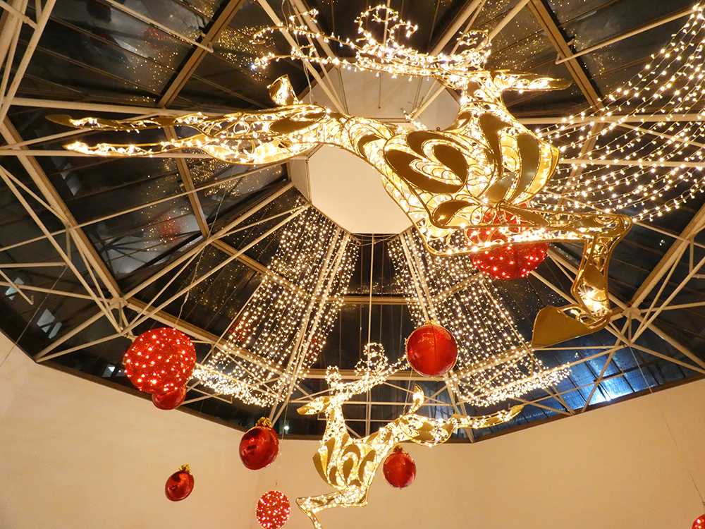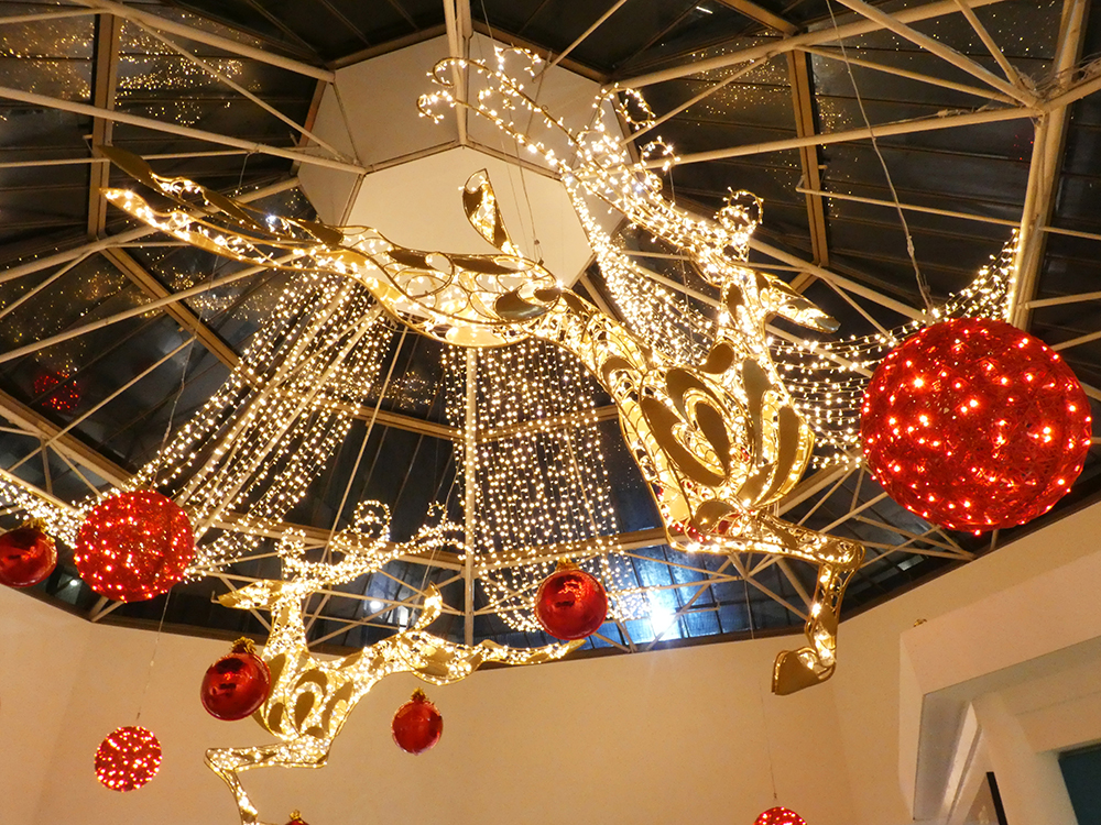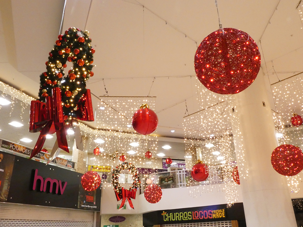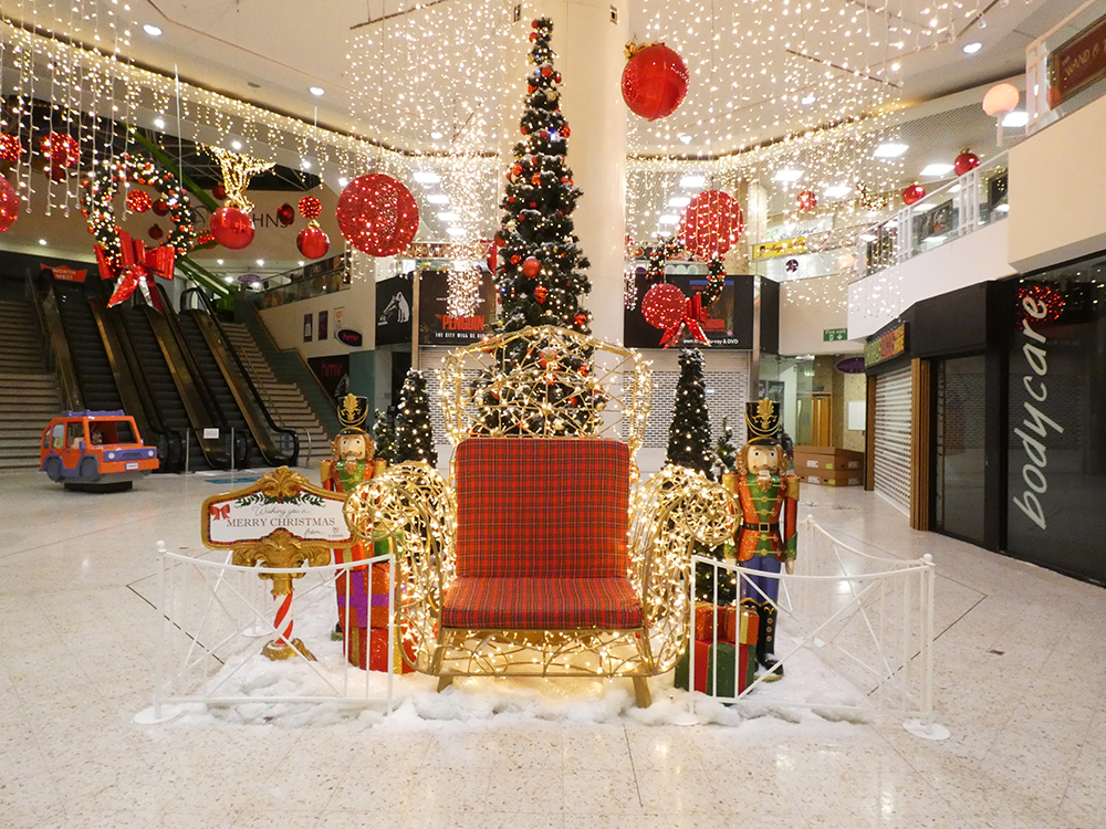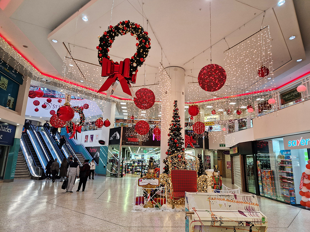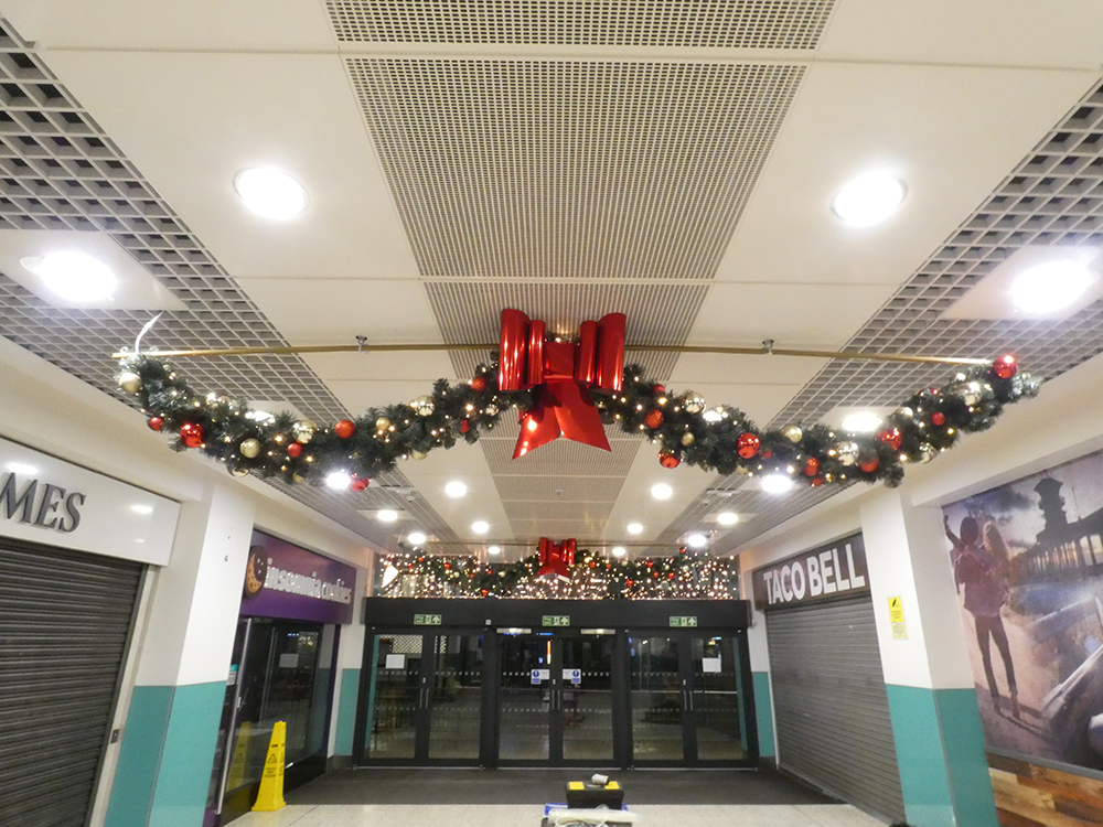 Our “Timeless Celebration” scheme at St Johns Leeds Shopping Centre! We created a classical blend of rich ruby reds and shimmering golden lights against lush greenery. The centre featured beautiful hanging illuminated reindeers with a variety of Illuminated and shiny red baubles and drape lights. Wreaths and Garlands throughout the centre giving the classical festive feel and ambiance.