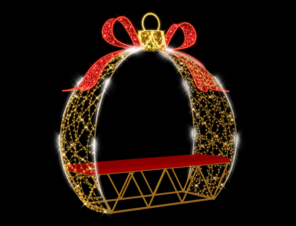 Introducing our Bauble photo op with seat, a beautiful and charming Christmas prop. Standing tall at 220 cm. Crafted from premium aluminium and illuminated with warm white LEDs, the baubleËÇÖs IP65 rating ensures it dazzles rain or shine. Generate engagement, comments, shares, reactions, brand awareness and share-worthy moments with our Photo Opportunity Light Motif range
