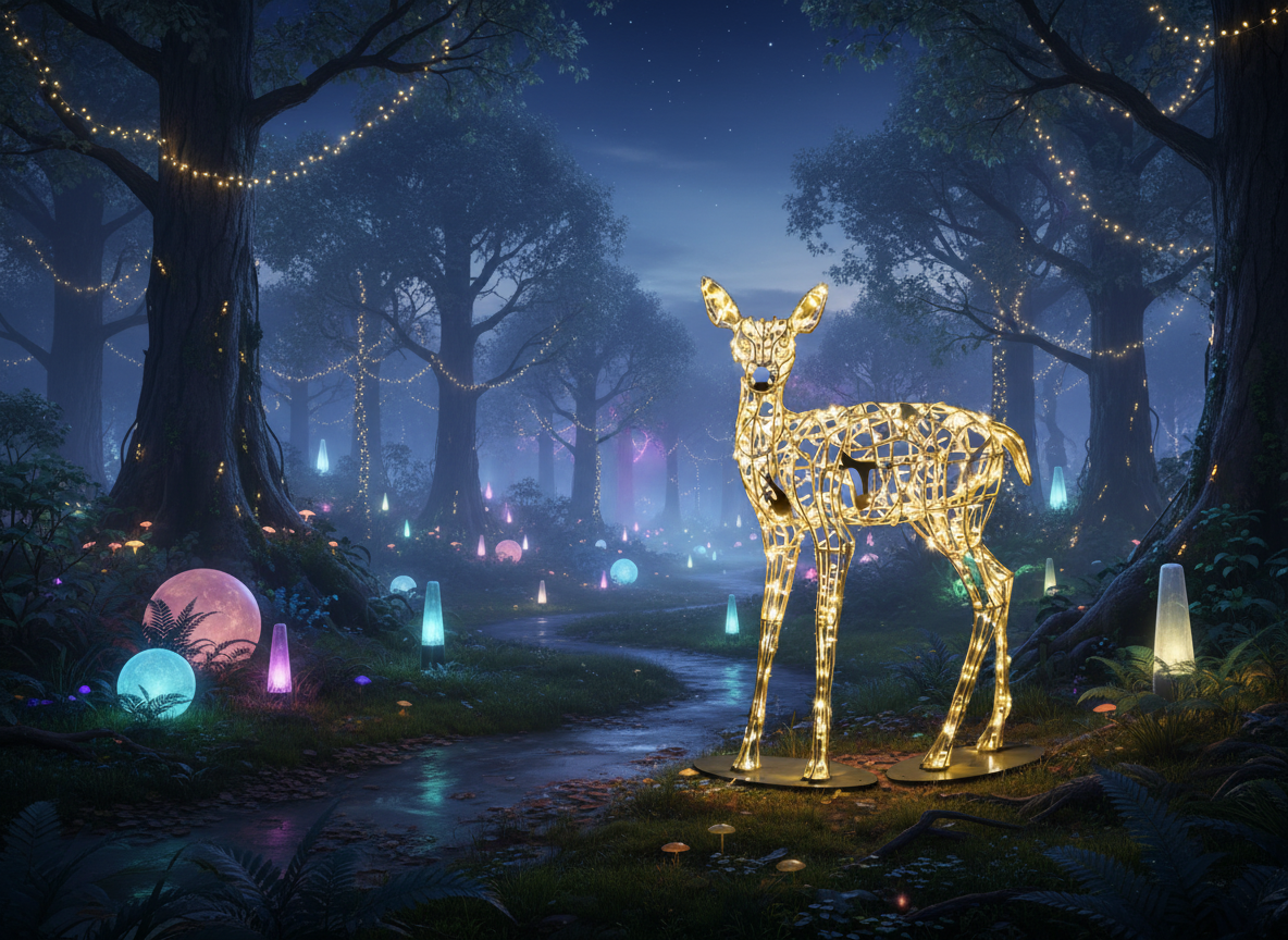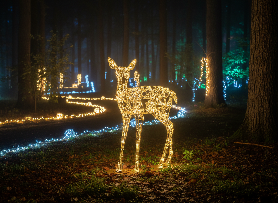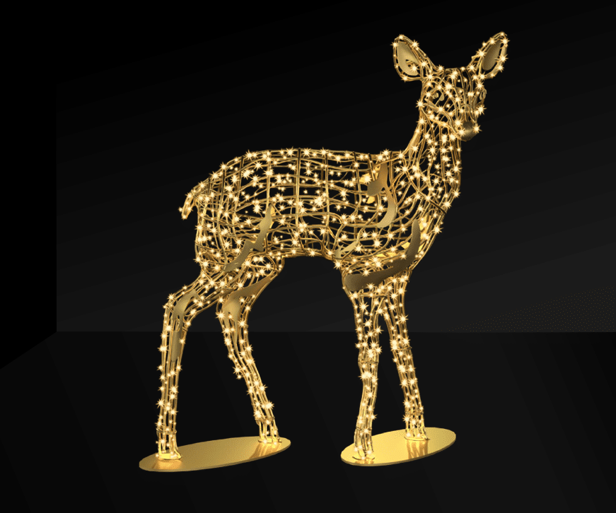 Introduce a touch of wonder to your outdoor events or light trail with the Deer, standing elegantly at 167 cm tall with a striking warm white glow that captivates Perfectly designed for floor mounting and boasting a robust IP67 rating, this eye-catching piece is built to withstand the elements, making it an ideal centrepiece for gardens, parks or festive displays. Offering a fantastic photo opportunity for guests and visitors to create lasting memories. The included transformer and low-voltage 22W operation guarantee both safety and energy efficiency, while the sturdy 68 kg build keeps it solidly in place. Whether you’re curating a magical winter wonderland, enhancing a light trail, or simply seeking a gorgeous Christmas addition, the Junior Deer promises to inspire smiles and shine in every setting.