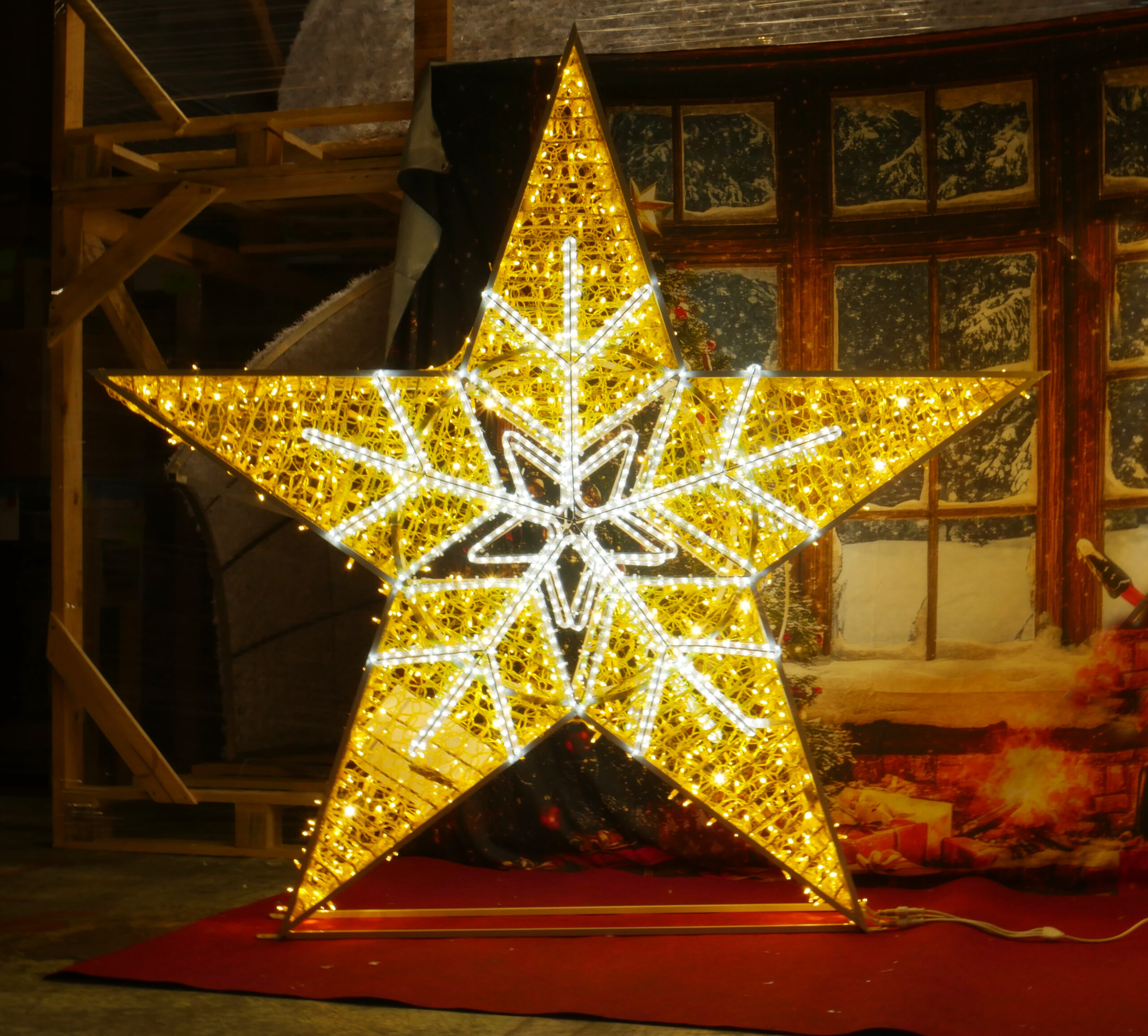 Introducing the Star, 210x30x200cm a striking centrepiece designed to light up your space with festivity and charm. Crafted from durable aluminium, this floor self-standing illuminated prop is suitable for both indoor and outdoor spaces, thanks to its IP65 rating and robust weather resistance. Featuring a mesmerising blend of warm white and white LEDs, it perfect for any Christmas display, event or venue, while the included transformer and extra-long 5-metre power cord make installation effortless. Its impressive 210cm height and 200cm length ensure it stands out in any space.